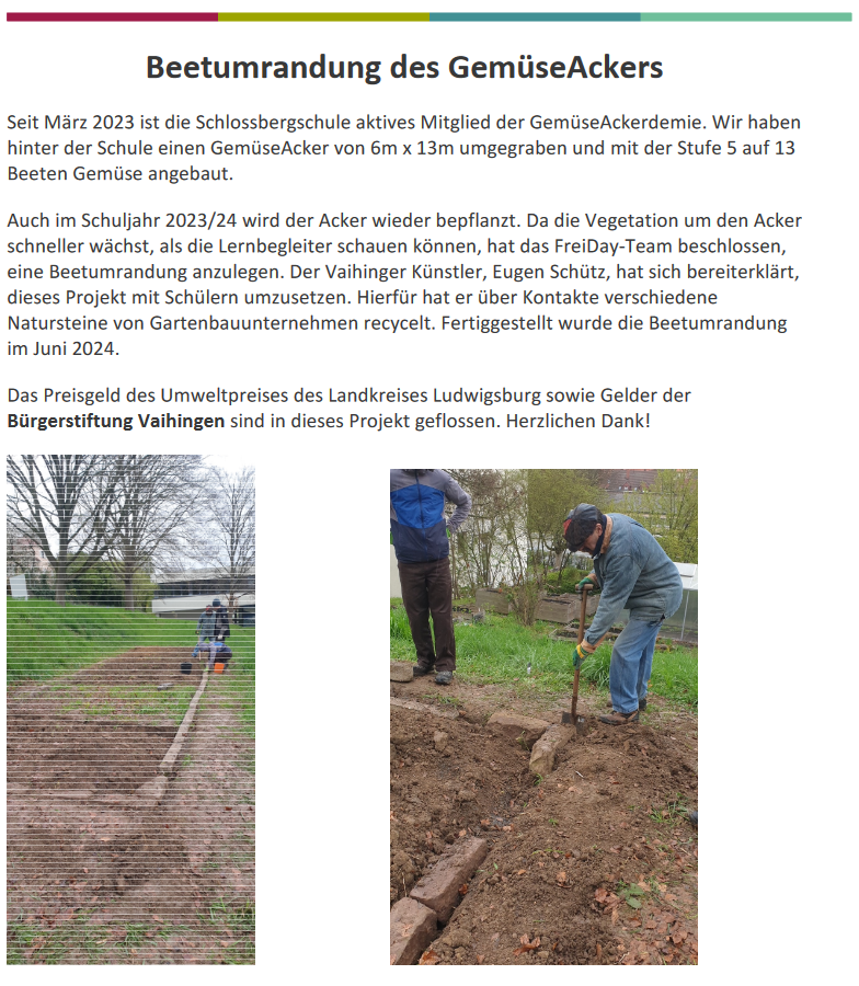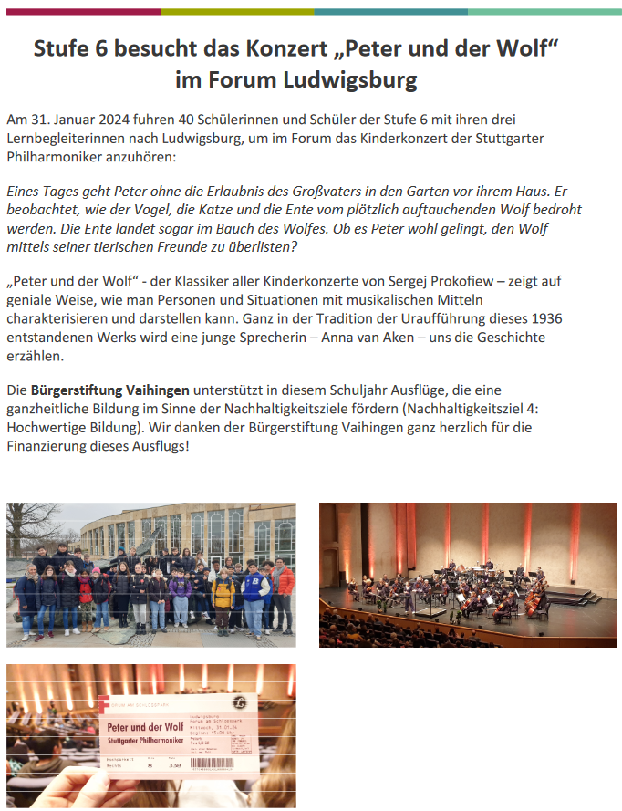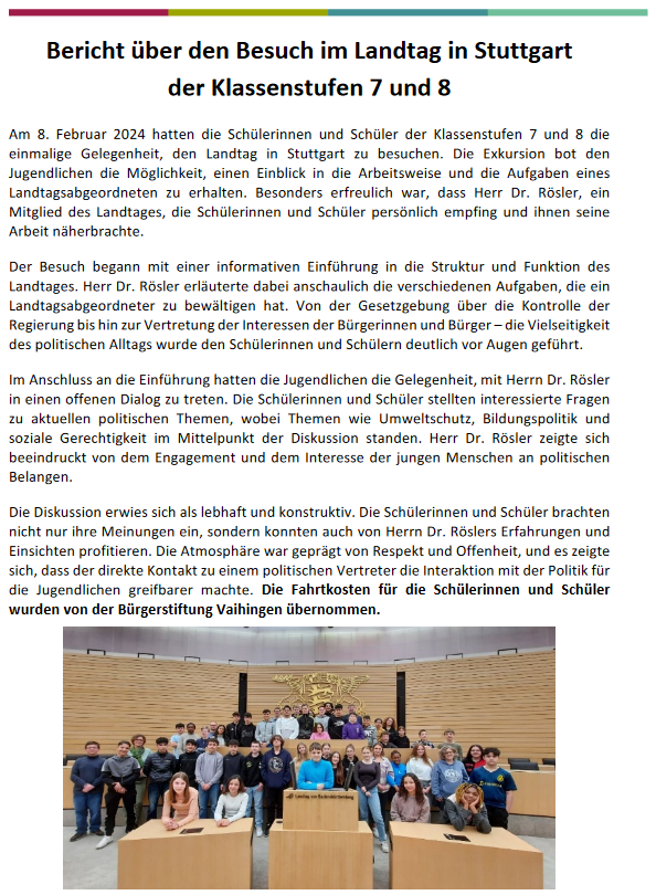Im Schuljahr 2023/ 2024 können und konnten wir - Dank der Förderung durch die Bürgerstiftung Vaihingen - zahlreiche Exkursionen und Bildungsprojekte kostenneutral oder günstig für unsere Schülerschaft anbieten. Dafür sind wir als Schulgemeinschaft sehr dankbar.